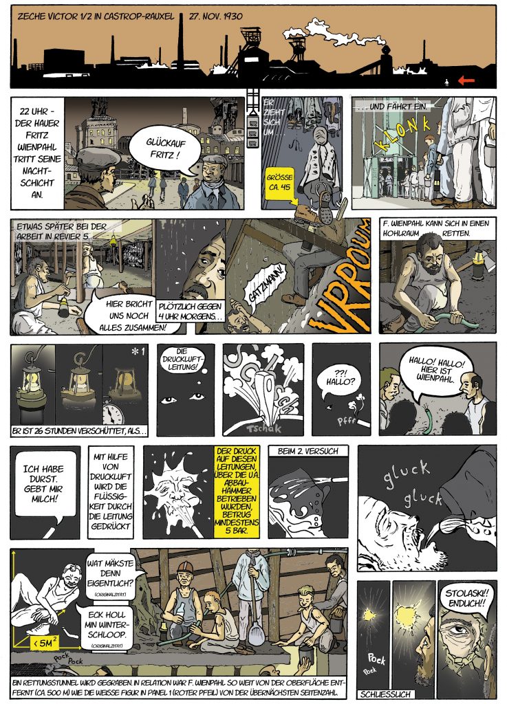 Schwieriger ließen sich zeit- und milieuspezifische Umgangsformen und Sprechweisen oder der individuelle Charakter Fritz Wienpahls fassen. Eine dem Verunglückten selbst zugeschriebene Schilderung des Geschehens in einem Bericht war hierbei allerdings hilfreich. Sie findet sich in z.T.  abgewandelter Form in den Sprechblasen wieder.