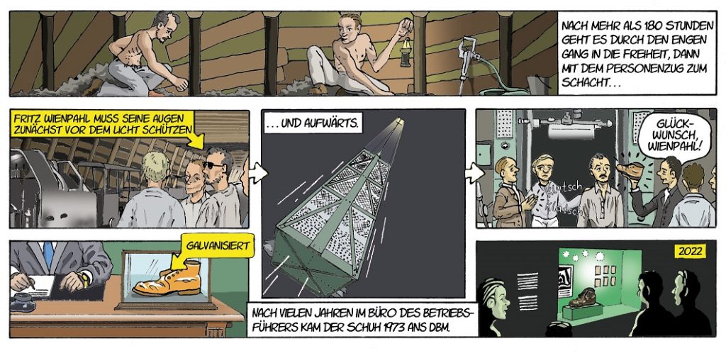 Der Comic „Der Schuh des Jahrhunderts“ – der Name ist im Übrigen eine Schöpfung der zeitgenössischen Zeitungsberichterstattung über die Rettung Fritz Wienpahls – wurde im November 2022 in der Publikation montan.dok-news des Deutschen Bergbaumuseums Bochum veröffentlicht und ist dort aktuell zusammen mit dem Originalobjekt in der Ausstellung „Doppelbock auf Museum. Das bewegte Fördergerüst“ (15.5.2024-18.05.2025) zu sehen.