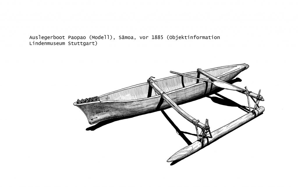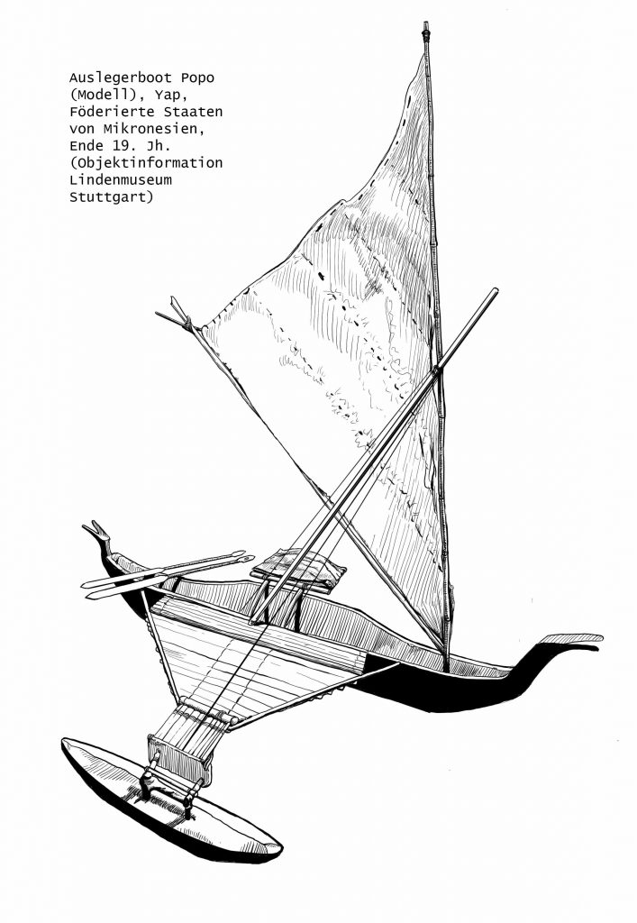 Überall in Ozeanien bestimmten Auslegerboote das Bild. Kleine mit Paddeln bewegte Boote kamen in den Lagunen oder entlang der Küsten zum Einsatz, während hochseetüchtige Segelboote Entfernungen von tausenden von Kilometern zwischen Inseln überwanden. Dabei kamen hochentwickelte Navigationstechniken zum Einsatz, die u.a. den Sternenkompass sowie die Beobachtung des Meeres, des Himmels und natürlicher Phänomene umfassten. In der Südseeballade navigiert der Maori Tarao in einer Szene, indem er sich an einem Hai orientiert, dem er mythische Eigenschaften zuschreibt. Boote gehörten zu den wichtigsten Besitztümern der Bewohner Ozeaniens, trugen sie als Mittel des Fischfangs doch maßgeblich zu ihrem Lebensunterhalt bei. Bei Strafexpeditionen zerstörten die Deutschen neben Palmenhainen, Hütten und Gerätschaften daher oft gezielt die Boote. Dem Kanu- und Bootsbau der Südsee galt auch das besondere Interesse der Ethnologen, bezeugten sie doch die kulturellen Leistungen der vermeintlichen „Primitiven“, deren Besiedelung der pazifischen Inselwelt mit einfachen Mitteln und Techniken bis in die entlegensten Archipele eine gewisse Bewunderung hervorrief. Ethnologen wie Felix von Luschan dokumentierten und sammelten ganze Boote und v.a. auch die handlicheren Bootsmodelle. Letztere wurden von einheimischen Experten für den Verkauf oder im Auftrag von Europäern hergestellt und verdeutlichen nicht nur ihre komplexe Konstruktion, sondern auch ihre kunstvolle Gestaltung. Die Befestigung der Ausleger und die Form des Segel konnte variieren. Das Modell des Popo wurde dem Linden-Museum von dem zwischen 1901 und 1909 für die deutschen Kolonien in Mikronesien zuständigen Bezirksamtmann Arno Senfft (1864-1909) übergeben. Senfft gehörte verschiedenen Handelskompanien an und war an der Inbesitznahme mehrerer Inseln sowie einer Strafexpedition in Palau beteiligt.
