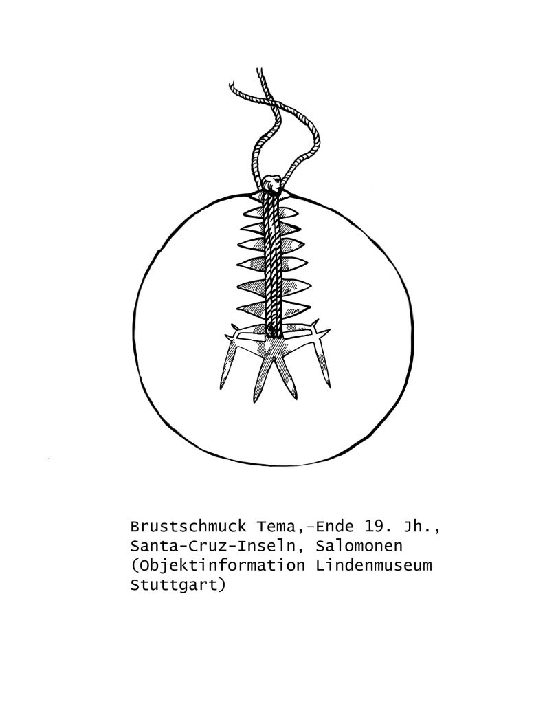Wertvolle und prächtige Schmuckobjekte waren in den historischen Gesellschaften Melanesiens Zeichen des hohen sozialen Status und als solche i.d.R. den Männern vorbehalten. Gesellschaftliche Stellung leitete sich aus der Zugehörigkeit zu bestimmten Abstammungslinien und Familien ab. Darüber hinaus war Schmuck mit bestimmten Situationen oder Kontexten wie Heirat, Trauer oder bestimmten Feiern und Zeremonien verknüpft. Nasenstäbe, die man durch die durchbohrte Nasenscheidewand führte, wurden auf den Admiralitätinseln sowohl von Männern als auch Frauen getragen. Zu Beginn des 20. Jahrhundert war dieser Schmuck allerdings nur noch selten zu finden. Hugo Pratt zeigt hier verschiedene Ausführungen. Schmuckscheiben mit Schildpattauflage waren auf den Admiralitätsinseln Männern dagegen vorbehalten. Die als tema bezeichneten Stücke gehörten zum hochgeschätzten Besitz eines Mannes und wurden zu festlichen Gelegenheiten getragen. Dass die oben gezeigten herausgeputzten Krieger in der Südseeballade einer Feierlichkeit beiwohnten ist nicht ersichtlich. Vielmehr scheinen sie auf einer Art Strandpatrouille zu sein. Die abgebildeten Objekte wurden dem Museum 1907 als Teil eines Konvoluts durch Max von Grapow (1861-1924) übergeben, der als Kommandant des kleinen Kreuzers SMS Cormoran 1901 an verschiedenen blutigen Strafexpeditionen in der Region beteiligt war.