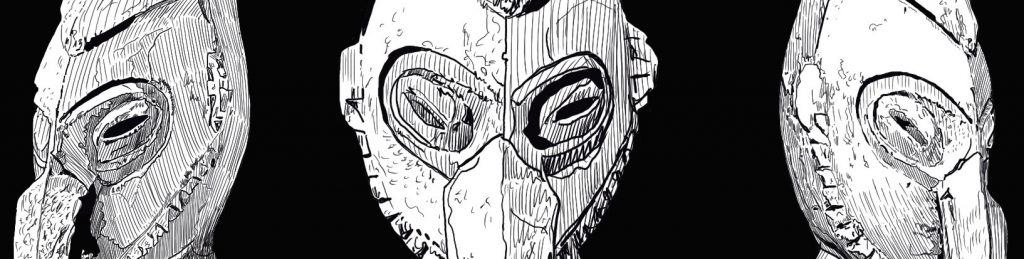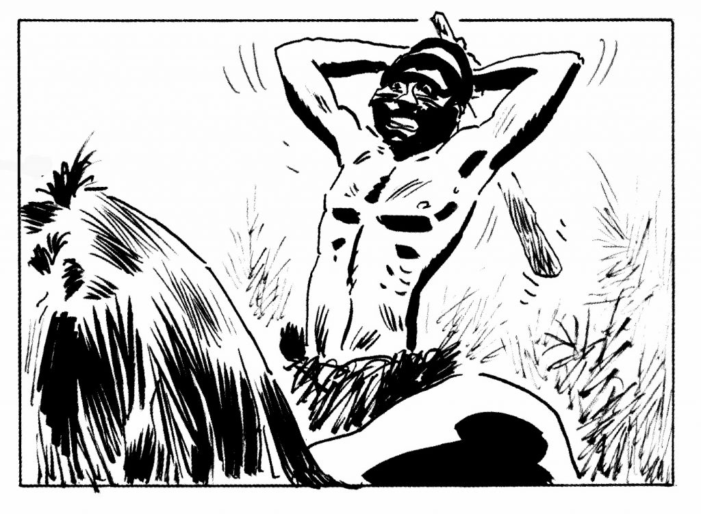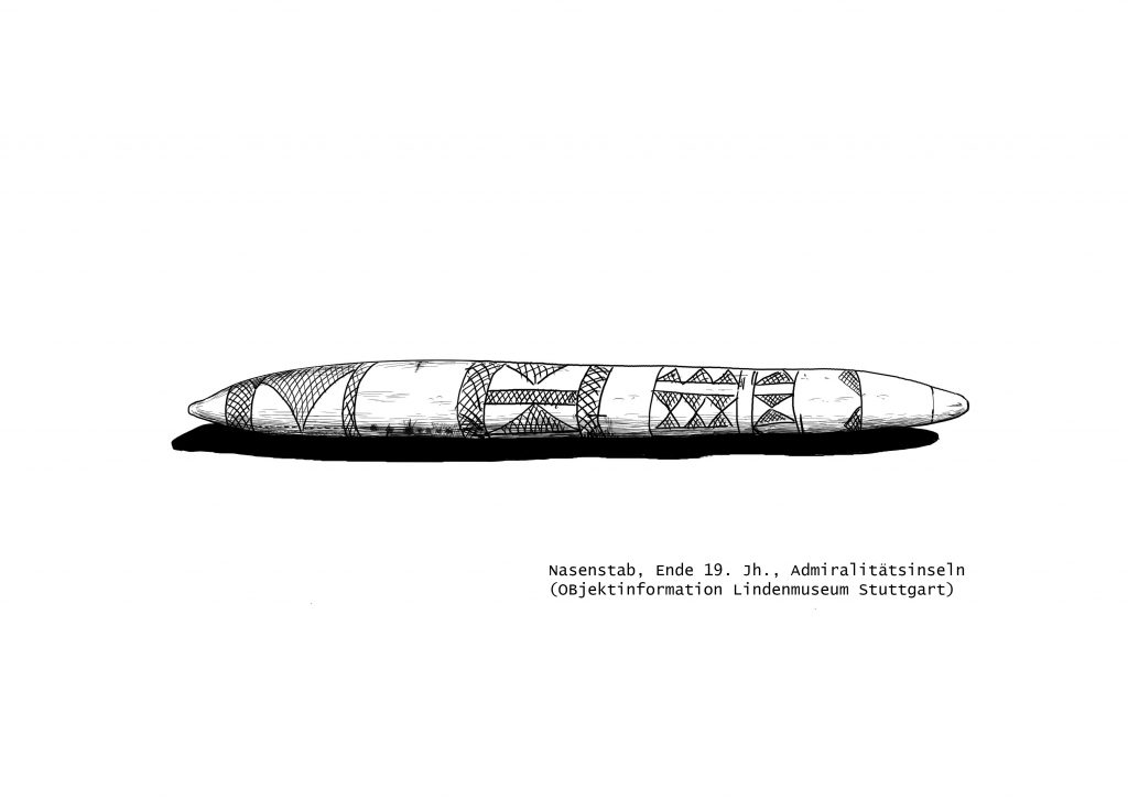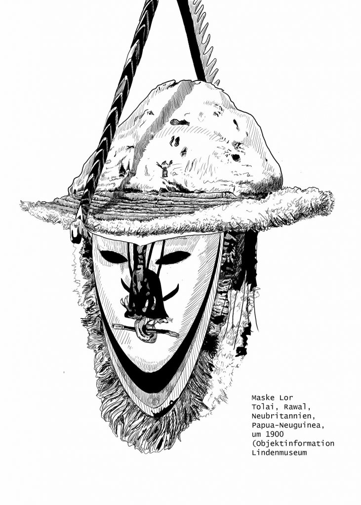 Im Folgenden möchte ich zum einen das in der Südseeballade entworfene Bild dieser einheimischen materiellen Kultur, zum anderen die Darstellung des kolonialen Kontextes betrachten, insbesondere die Darstellung der Einheimischen und ihres Verhältnisses zu den zentralen Figuren. In Bezug auf die kulturellen Aspekte nehme ich eine vertiefende Kontextualisierung vor, die losgelöst vom eigentlichen Narrativ sowohl Funktion, Ursprünge, Namen und Bedeutung der abgebildeten Objekte, als auch die Auswirkungen der Kolonialherrschaft thematisiert. Als Grundlage dient dabei die unter kolonialen Vorzeichen erworbene Ozeanien-Sammlung des Stuttgarter Lindenmuseums. Eigene Zeichnungen von Objekten aus der Dauerausstellung stelle ich dabei Szenen aus dem Comic gegenüber.