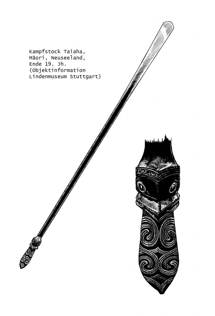 Diese Art von Kampfstock wurde taiaha genannt und sowohl als Schlag- als auch als Stoßwaffe eingesetzt. Andererseits diente er auch als Rednerstab und Statuszeichen. Das Ende des schmuckvolleren Stocks aus dem Linden-Museum zeigt ein stilisiertes Gesicht mit herausgestreckter Zunge.