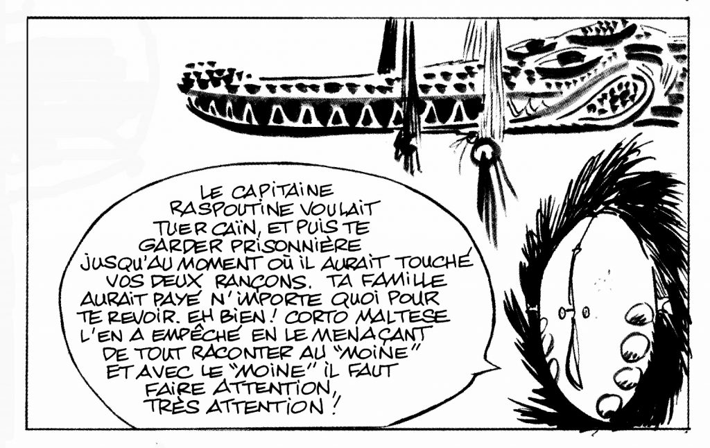 Im Glauben, dass dieser seiner Sprache nicht mächtig ist, spricht er diesen in Anspielung an Robinson Crusoe in einer Art Galgenhumor angesichts seines eigenen Schicksals als „Freitag“ an. Daraufhin stellt sich heraus, dass der junge Maori nicht nur die Sprache Cains beherrscht, sondern auch dessen literarische Anspielungen versteht. Seine westliche Bildung führt er auf seine Zeit in einer katholischen Missionsschule zurück. Wie bei vielen seiner enigmatischen und vielschichtigen Charaktere lässt Hugo Pratt den Leser aber auch im Fall des Maori über dessen wahre Natur im Unklaren – später entpuppt dieser sich dann als ein neuseeländischer Spion. Literarische Südsee-Assoziationen und daraus gespeiste Vorurteile gegenüber ihren Bewohnern, wie sie Cain und gleichzeitig auch dem Comic-Leser zu eigen sind, werden hier mit einer komplexen Realität konfrontiert.
