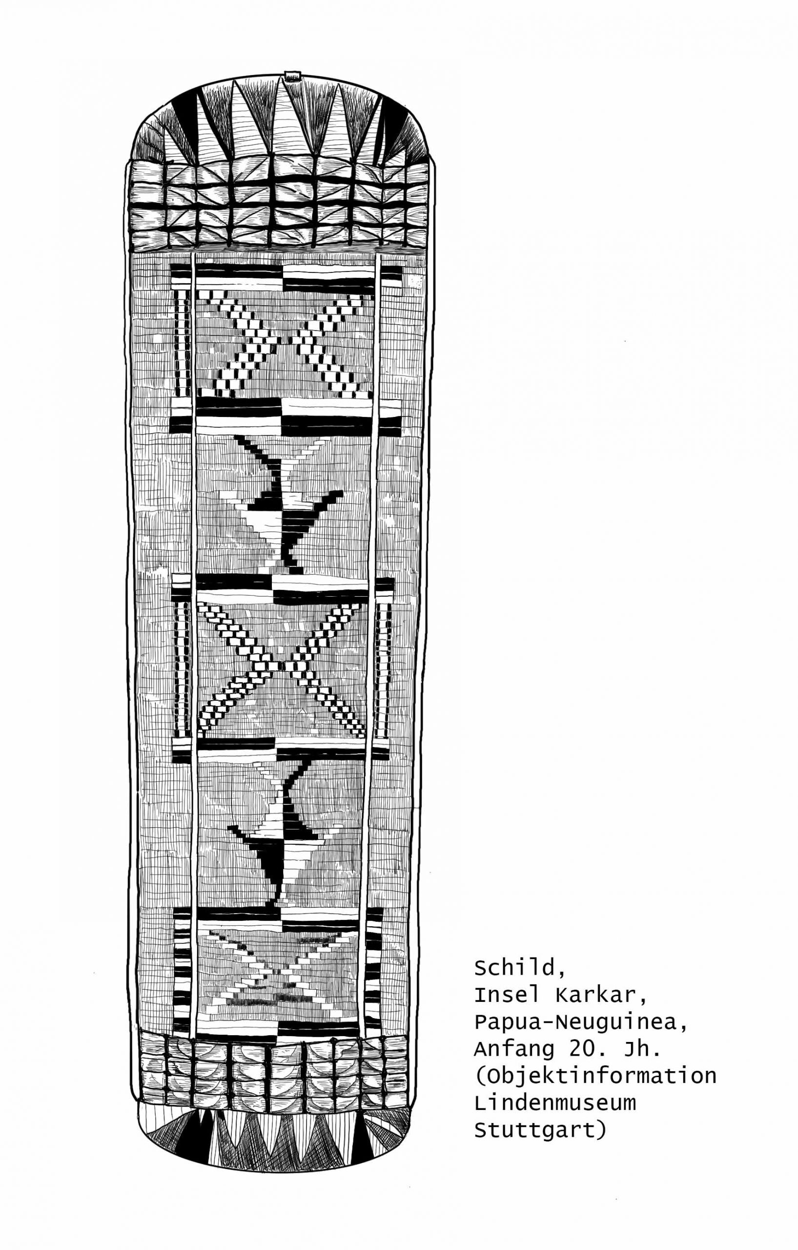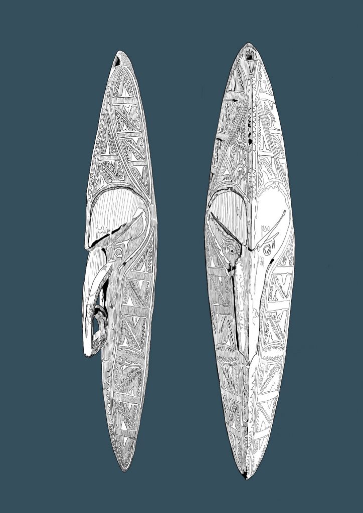Schilde sollten nicht nur ihre Träger schützen, sondern auch den Gegner beeindrucken und erschrecken. Ihre Gestaltung nimmt oftmals Bezug auf die Mythologie und die Welt der Ahnen. Schilde aus dem Gebiet der Nordküste Papua-Neuguineas sind i.d.R. schmal und hoch. Der abgebildete Schild besteht aus drei Holzplanken, die durch eine feste Rotangumwicklung zusammengehalten werden. Neben geometrischen Mustern sind hier zwei stilisierte Fischdarstellungen zu sehen.
