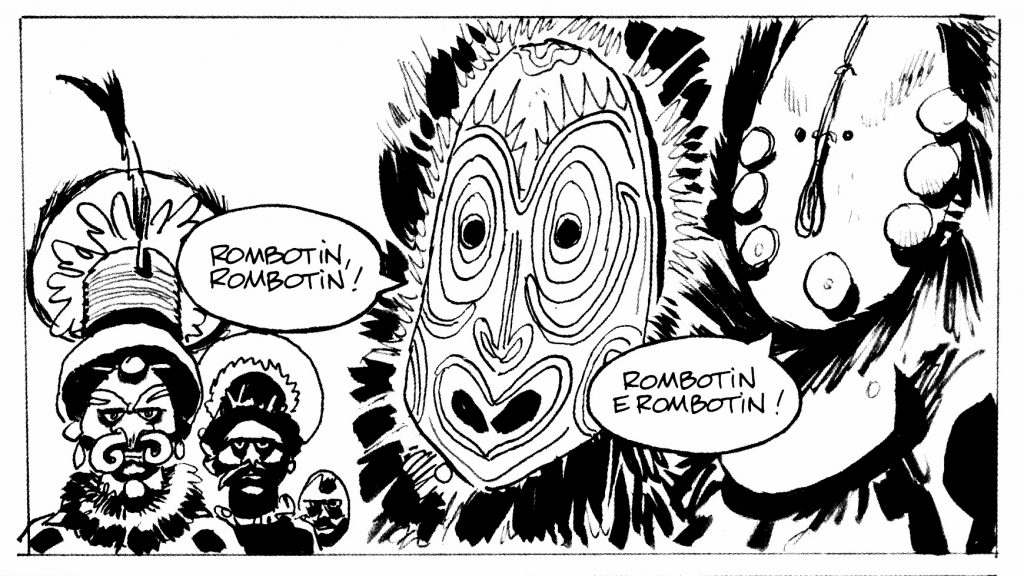 Konsequenterweise haben die Ausstellungsmacher anknüpfend an die Provenienzstudie des Museums viele der Objekte in der Dauerausstellung um Informationen zu den kolonialen Erwerbshintergründen ergänzt. Einige der dort präsentierten Objektarten lassen sich in der Südseeballade wiederfinden. In den eingeschobenen grünen Kästchen dienen diese Informationen neben den Zeichnungen der Ausstellungsobjekte dazu, die entsprechenden Szenen der Südseeballade ethnographisch und historisch zu kontextualisieren und sie so um eine Informationsebene anzureichern. Trotz vieler kultureller und stilistischer Gemeinsamkeiten zwischen den Völkerschaften der Südsee, weisen deren Kunst und materielle Kultur regionale Eigenheiten auf. In Ermangelung des erforderlichen Expertenwissens kann hier über die Nennung der Provenienz der musealen Vergleichsobjekte hinaus keine Einschätzung dazu erfolgen, ob es sich bei der Darstellung Hugo Pratts um eine Komposition kultureller Versatzstücke verschiedener ozeanischer Gemeinschaften handelt.