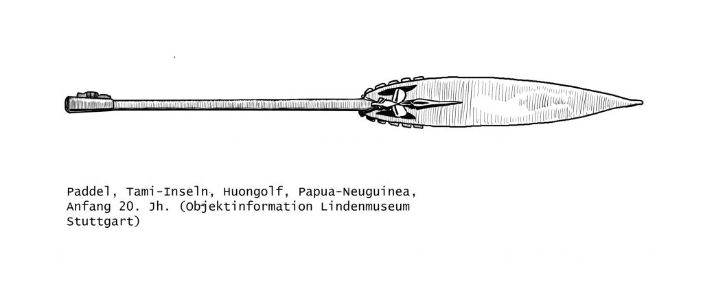 Solche spitzen Paddel dienten dem Antrieb kleinerer Boote und konnten reich geschmückt sein. An dem Paddel von den Tami-Inseln ist am Übergang zwischen Schaft und Blatt eine Gesichtsdarstellung im typischen lokalen Stil angebracht.