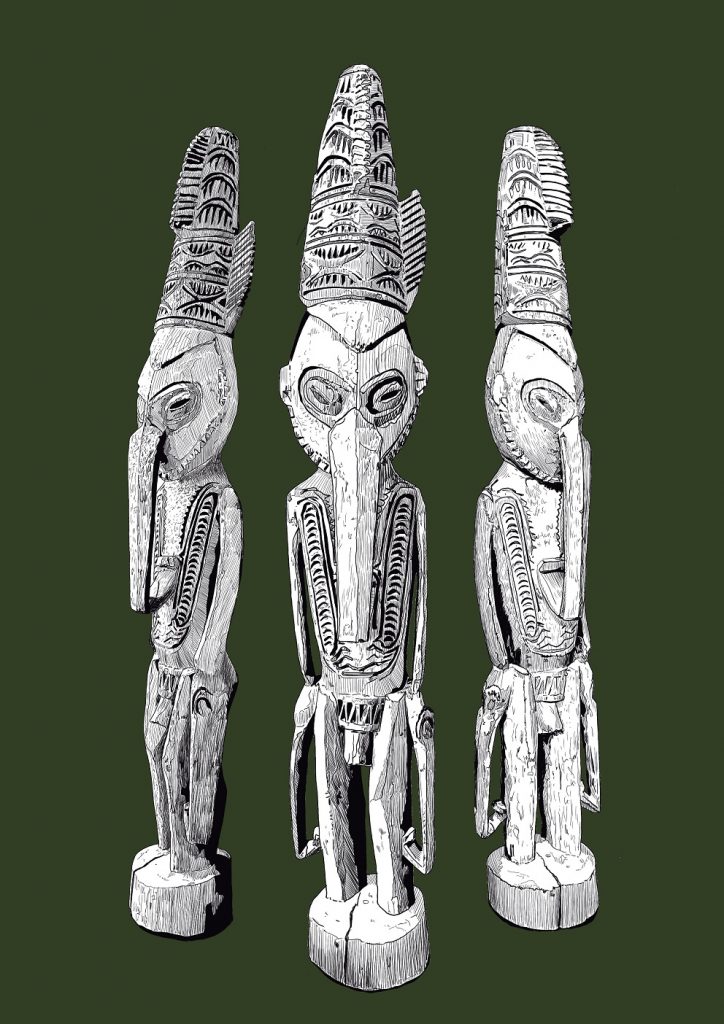Ob sie als Andenken für Touristen produziert wurden oder ursprünglich von den Einheimischen genutzte Objekte waren, ist mir ebensowenig bekannt wie der genaue Ort, an dem mein Großonkel in seiner Zeit als Missionar tätig war. Die von 1896 bis heute in Neu-Guinea aktiven Steyler-Missionare hatten ihr Zentrum ursprünglich in dem von Deutschen gegründete Alexishafen an der Nordostküste der Insel. Die Skulpturen weisen eine gewisse Ähnlichkeit zu Objekten vom Sepik-Fluss auf, dem längsten Fluss Neu-Guineas, der von den Deutschen in der Kolonialzeit Kaiserin-Augusta-Fluss genannt wurde, was ebenfalls auf den Nordosten des Landes hindeutet.