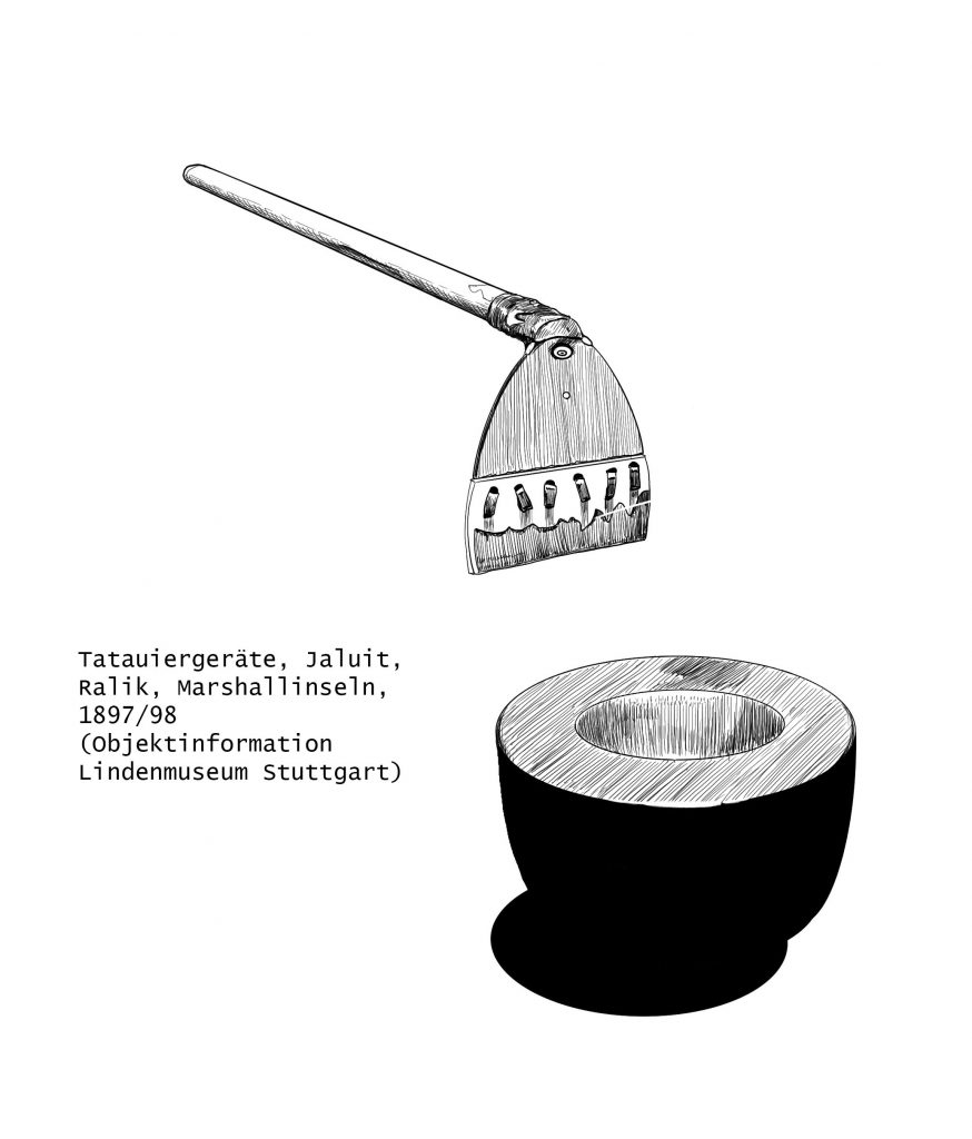 Tattoos gaben Auskunft über Rang und Status einer Person. V.a. in Melanesien kam daneben auch der temporären Bemalung des Gesichts und Körpers für Zeremonien, Feste oder besondere Anlässe Bedeutung zu. Die Gestaltung der Tattoos unterschied sich je nach Geschlecht und Rang und folgte sowohl in der Form als auch in der Platzierung bestimmten Konventionen. In manchen Gesellschaften waren Tattoos dagegen den Männern vorbehalten. Die Muster wurden mit spitzen Werkzeugen wie dem abgebildeten Kamm von den Marshallinseln in die Haut gestochen. Die Kämme wurden in Farbe getränkt, die dann mit Hilfe eines Klopfstabes in die Haut eingebracht wurden. Der Kamm wurde dem Museum von Augustin Krämer (1865-1941) übergeben, der von 1893 bis 1895 als Marinestabsarzt zur Besatzung eines in Sāmoa stationiertem Kriegsschiffes gehörte.