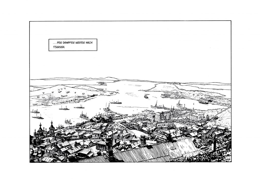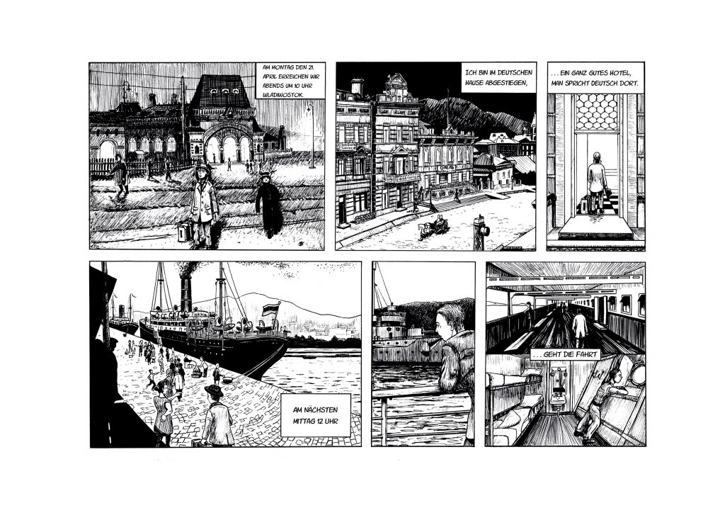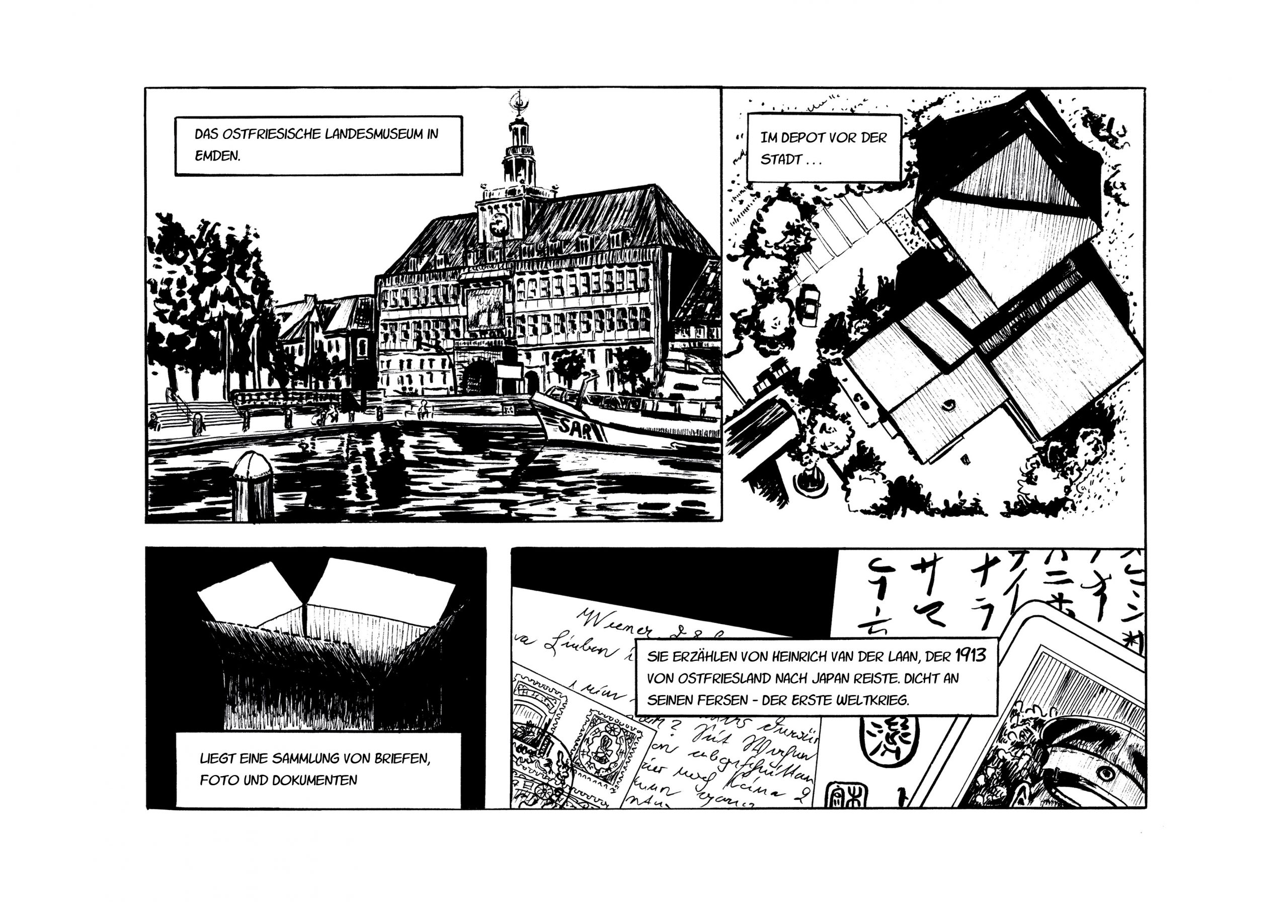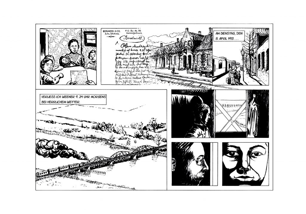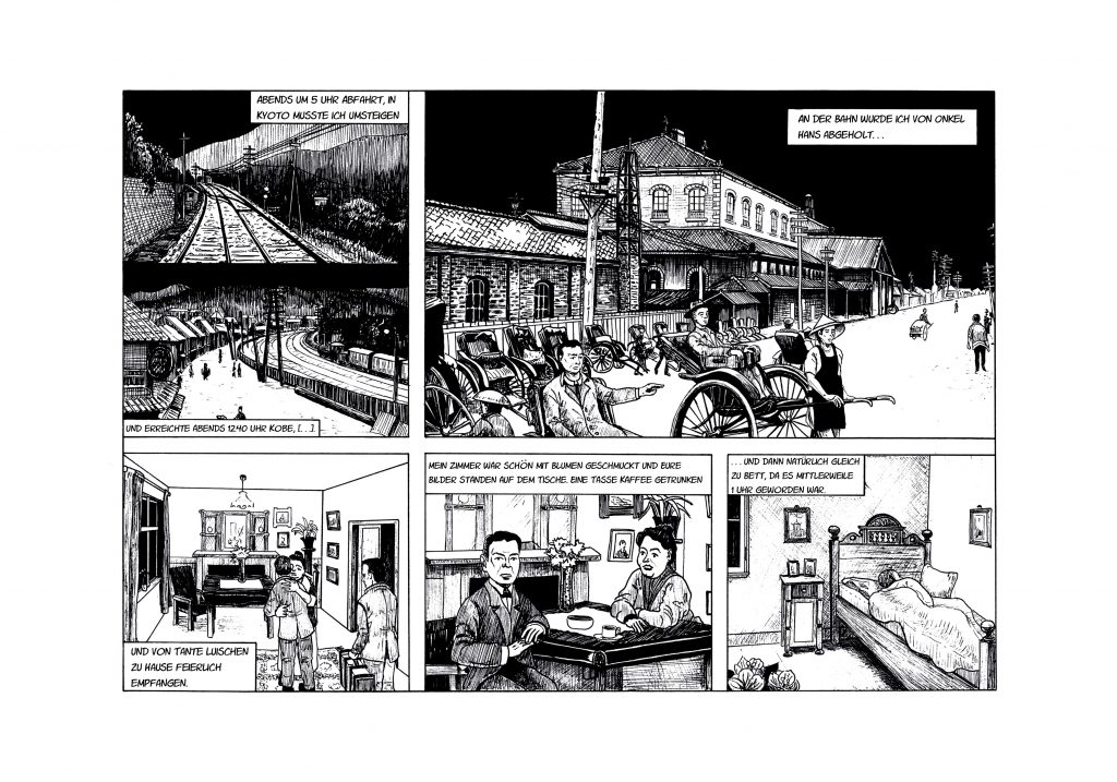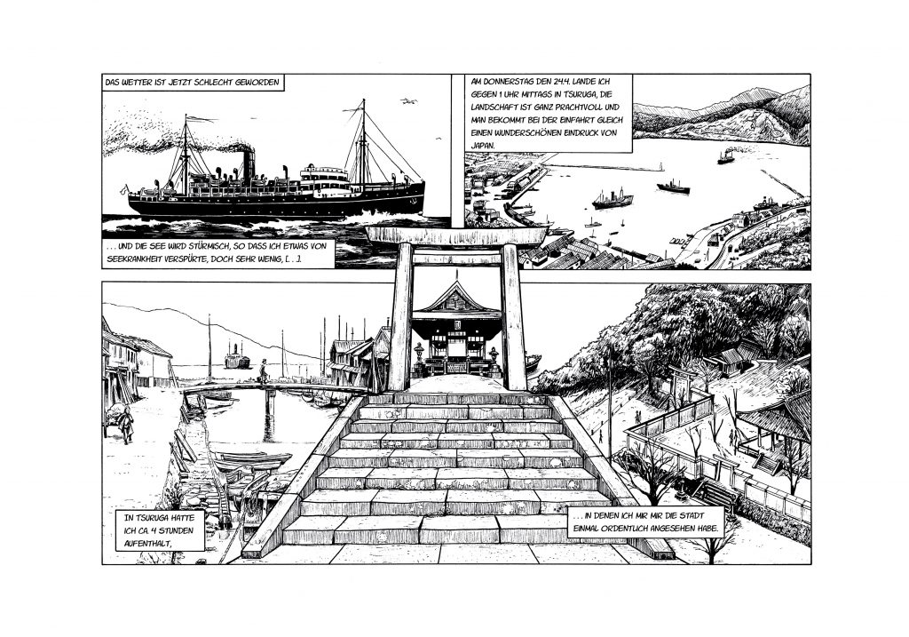 Bei dem folgenden Comic handelt es sich um das erste Kapitel von furyō. Es ist der Reise Heinrichs von Weener nach Kobe gewidmet und lehnt sich eng an die historischen Quellen an. Die Handlung basiert auf der eher nüchternen und knappen Reisebeschreibung, die Heinrich am 25. April 1913 kurz nach seiner Ankunft in Kobe an seine Eltern schickte. Mit einigen Kürzungen entspricht der Text dem Wortlaut dieses Reiseberichts. Für die Zeichnungen dienten wiederum zeitgenössische Fotographien, insbesondere Postkarten, als Vorlage. Historische Orte und Gegebenheiten sollten möglichst akkurat wiedergegeben werden. Im Detail wurden dabei allerdings gewisse Freiheiten in Anspruch genommen. So wird Heinrich z.B. an Orten gezeigt, die nicht ausdrücklich in seinem Reisebericht erwähnt werden, die er aber besucht haben könnte, etwa den Tempel in Tsuruga. Anhand des authentischen erzählenden Texts lässt sich der Grad der visuellen Interpretation durch den Autor des Comics aber leicht nachvollziehen.