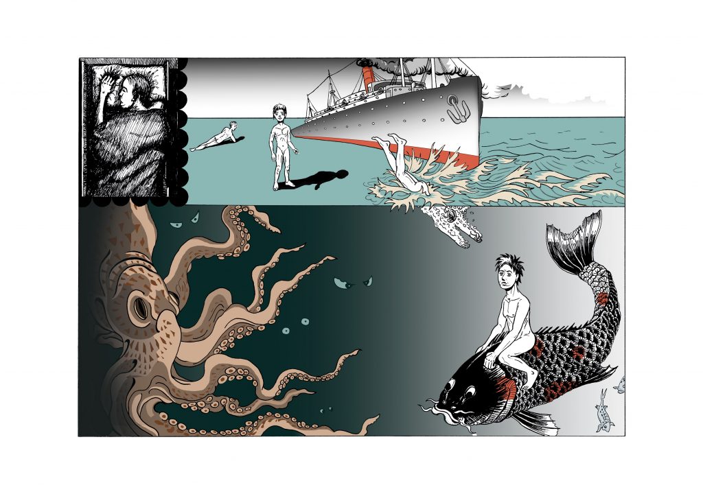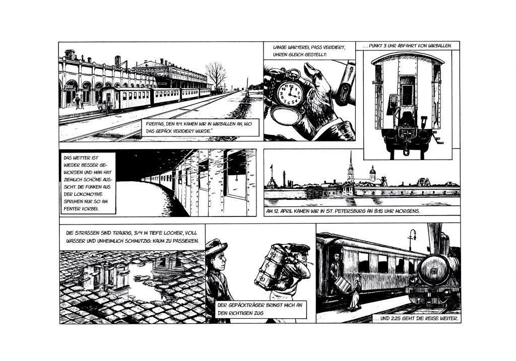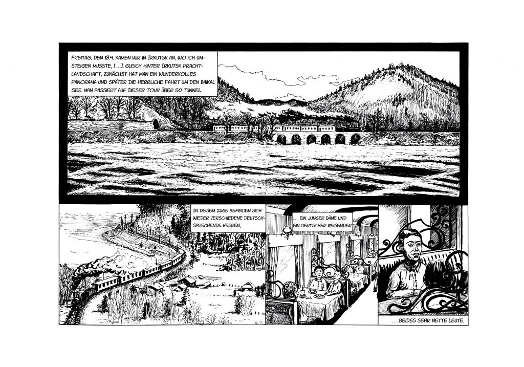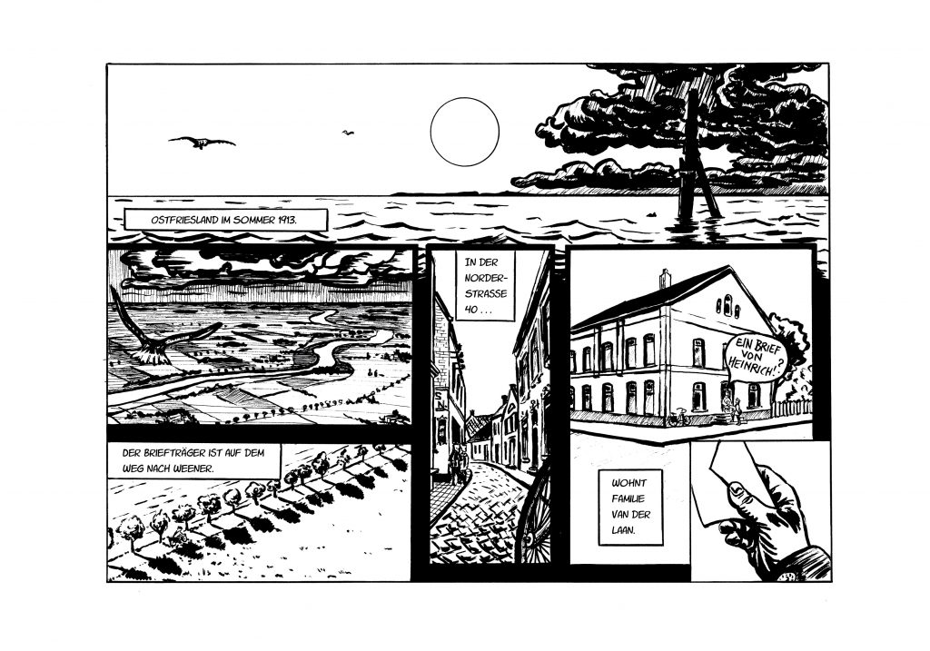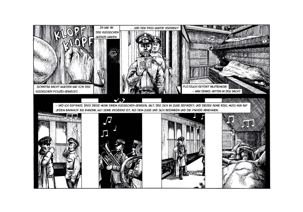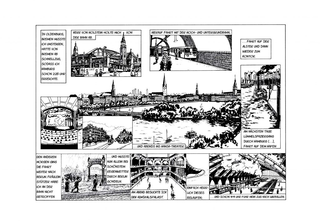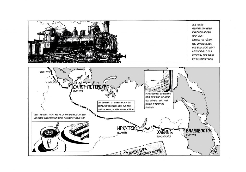 Bei dem folgenden Comic handelt es sich um das erste Kapitel von furyō. Es ist der Reise Heinrichs von Weener nach Kobe gewidmet und lehnt sich eng an die historischen Quellen an. Die Handlung basiert auf der eher nüchternen und knappen Reisebeschreibung, die Heinrich am 25. April 1913 kurz nach seiner Ankunft in Kobe an seine Eltern schickte. Mit einigen Kürzungen entspricht der Text dem Wortlaut dieses Reiseberichts. Für die Zeichnungen dienten wiederum zeitgenössische Fotographien, insbesondere Postkarten, als Vorlage. Historische Orte und Gegebenheiten sollten möglichst akkurat wiedergegeben werden. Im Detail wurden dabei allerdings gewisse Freiheiten in Anspruch genommen. So wird Heinrich z.B. an Orten gezeigt, die nicht ausdrücklich in seinem Reisebericht erwähnt werden, die er aber besucht haben könnte, etwa den Tempel in Tsuruga. Anhand des authentischen erzählenden Texts lässt sich der Grad der visuellen Interpretation durch den Autor des Comics aber leicht nachvollziehen.